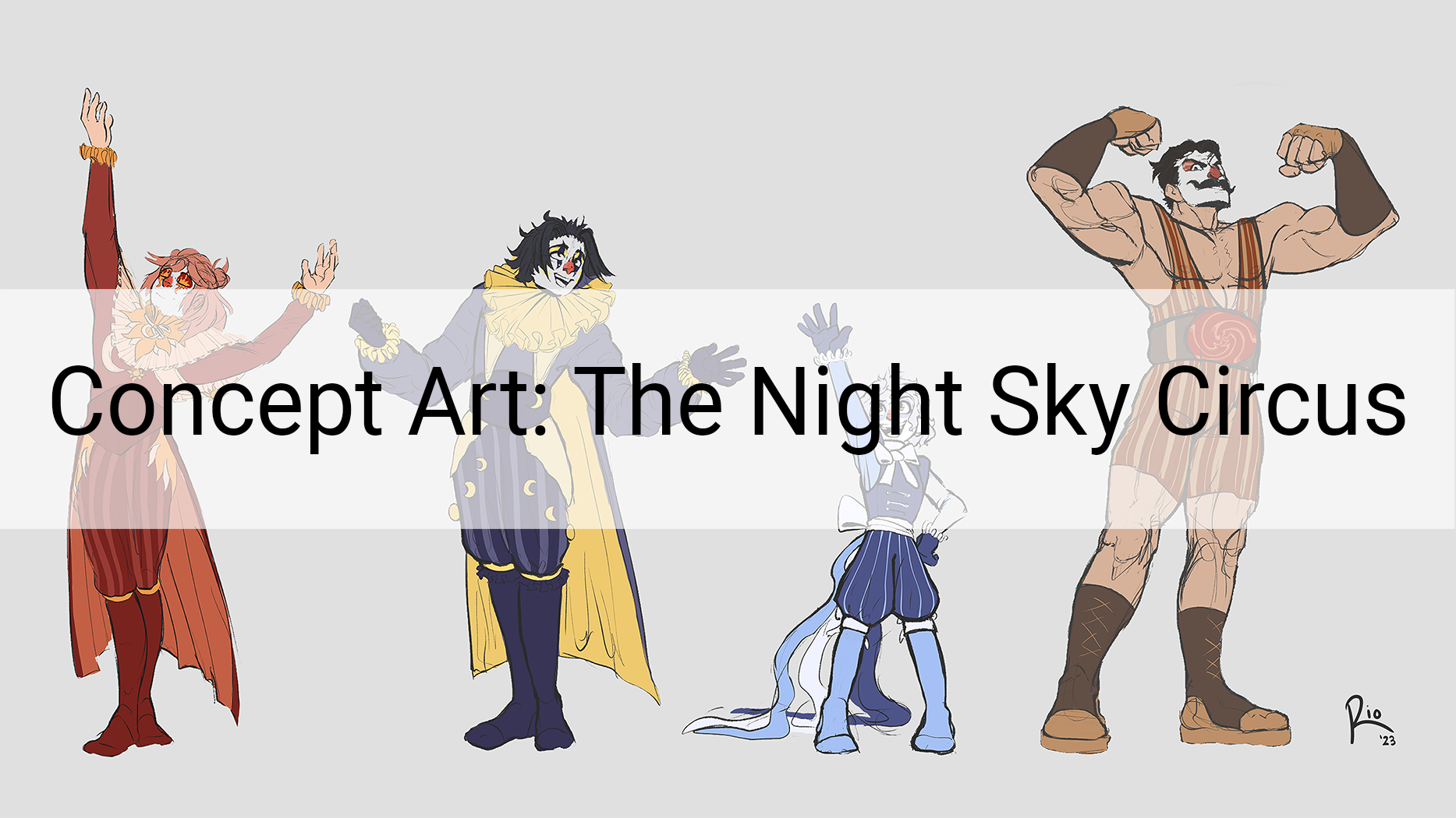 For my undergraduate senior thesis as a Midway Honors Scholar, I conceptualized a 4-character lineup of fictional circus clowns who are part of a space-themed circus named The Night Sky. This project is currently being reworked.