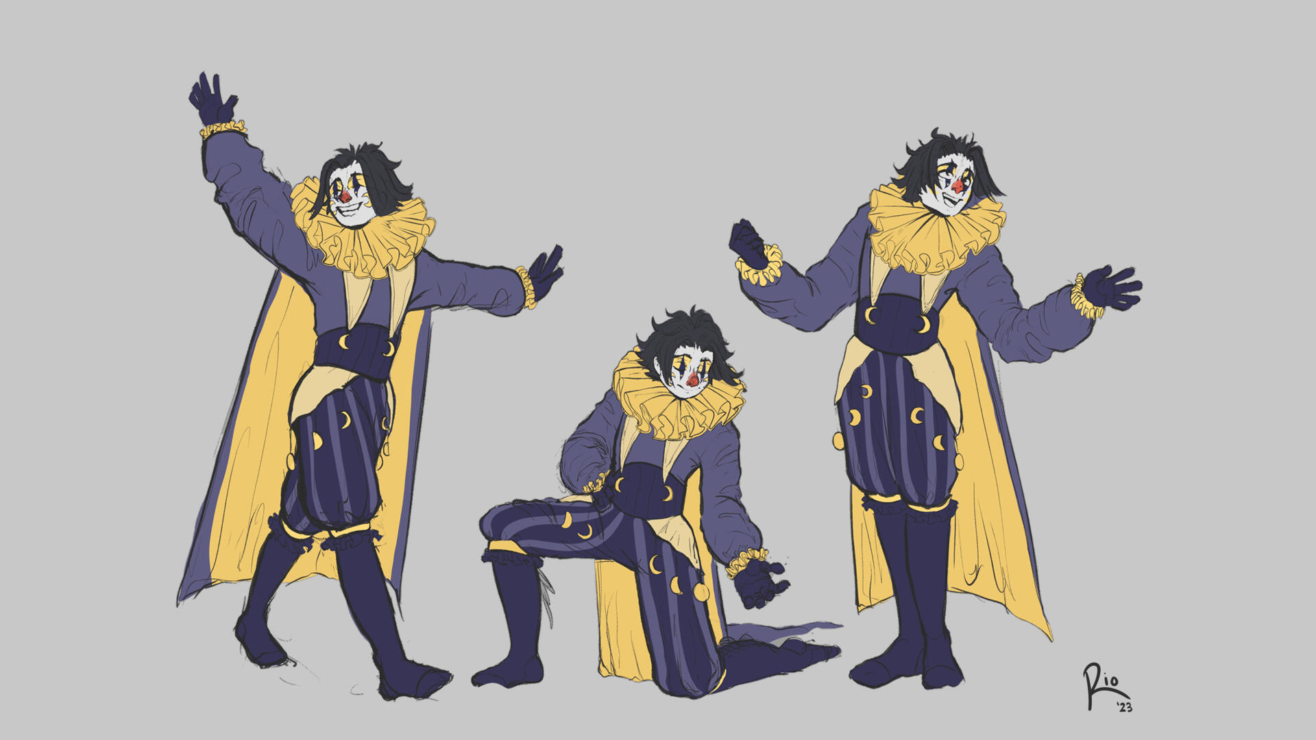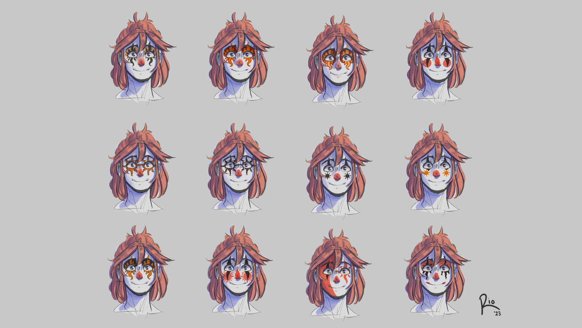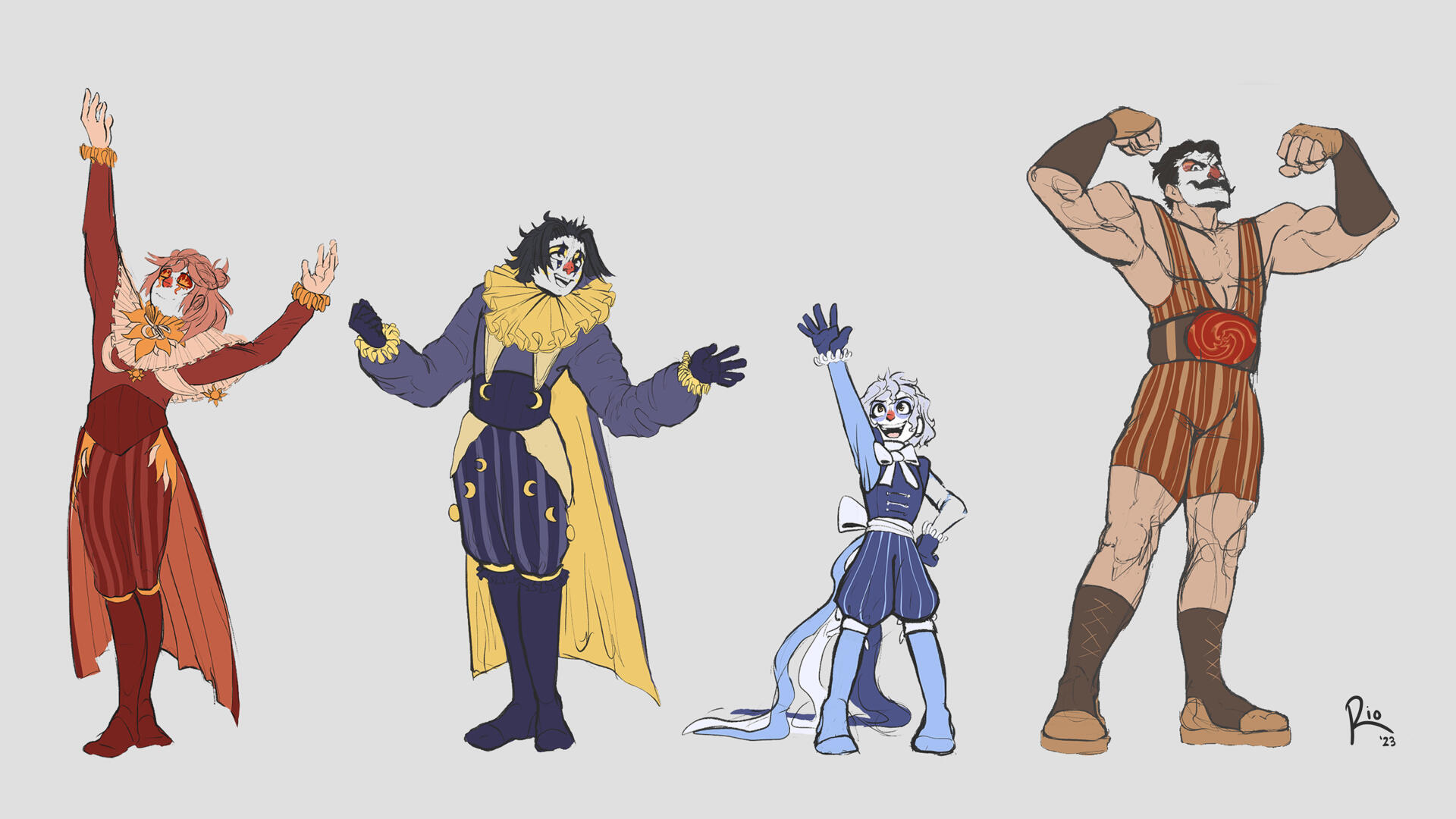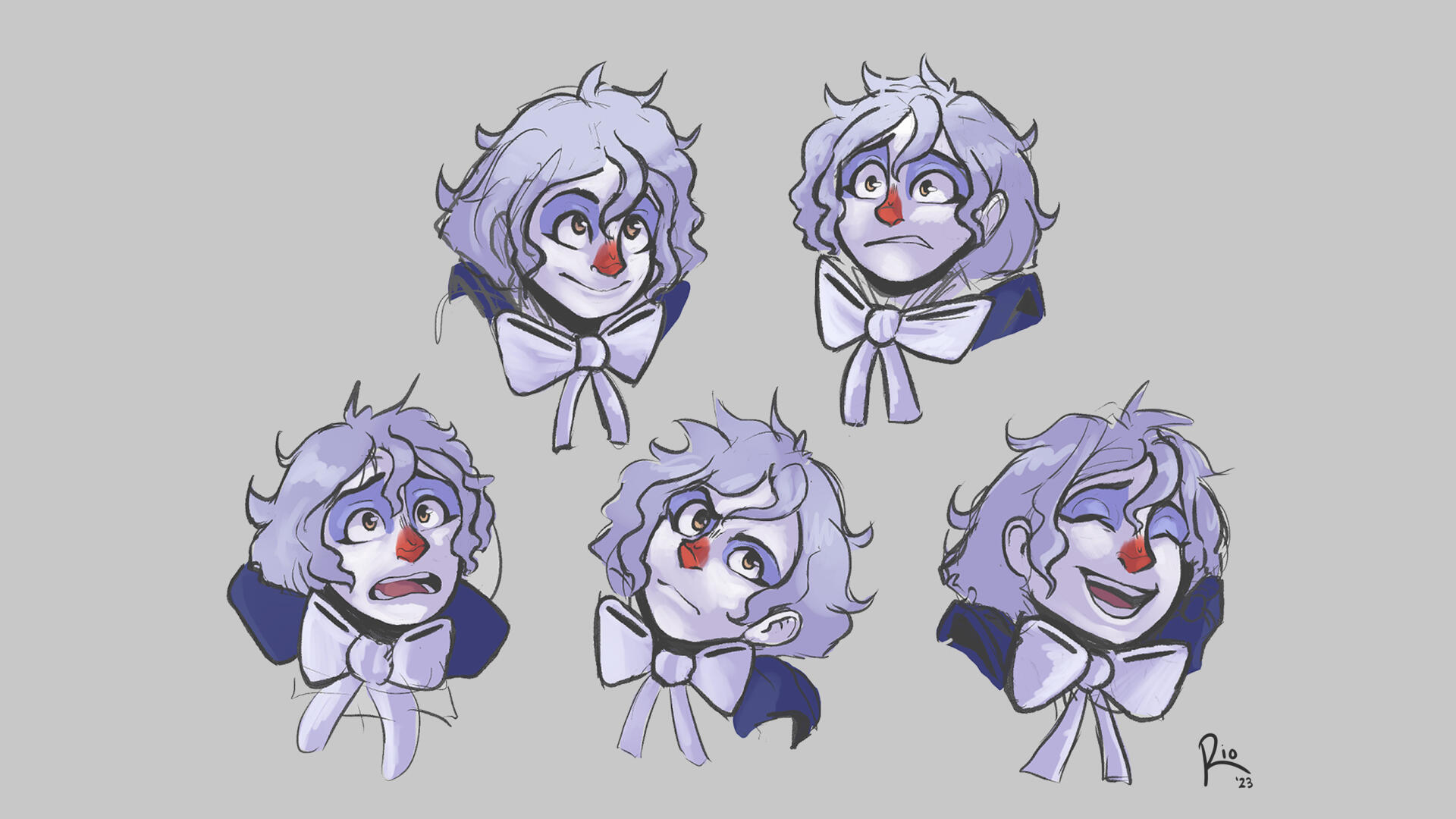 For my undergraduate senior thesis as a Midway Honors Scholar, I conceptualized a 4-character lineup of fictional circus clowns who are part of a space-themed circus named The Night Sky. This project is currently being reworked.