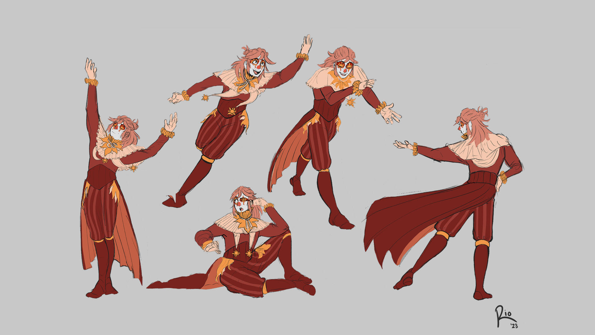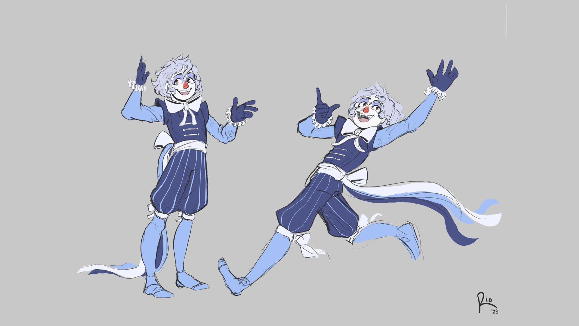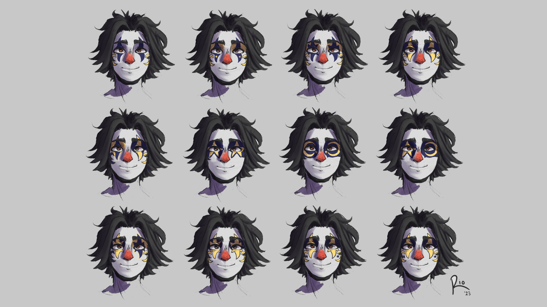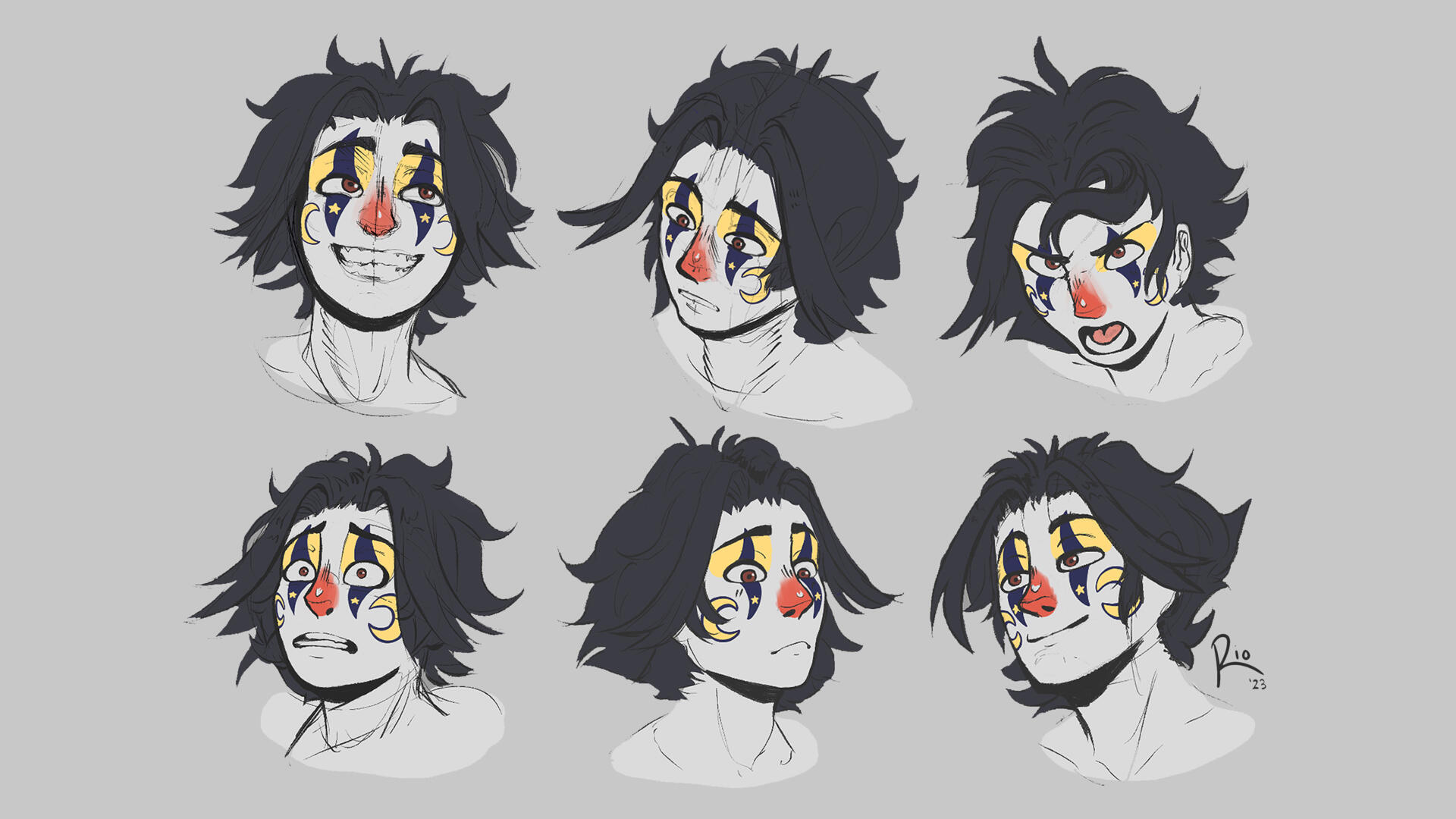 For my undergraduate senior thesis as a Midway Honors Scholar, I conceptualized a 4-character lineup of fictional circus clowns who are part of a space-themed circus named The Night Sky. This project is currently being reworked.